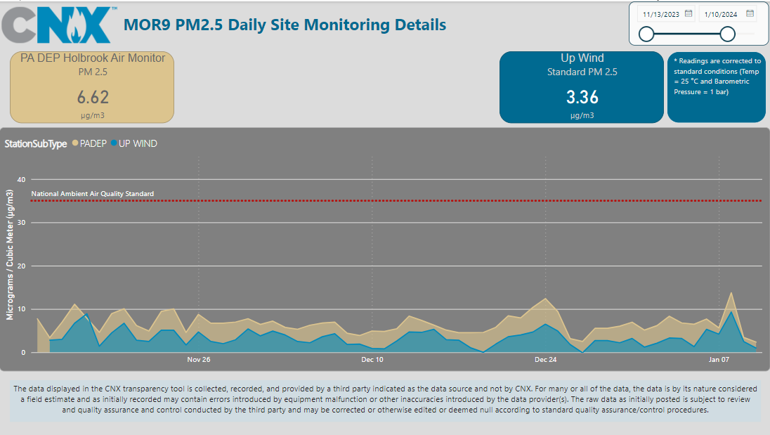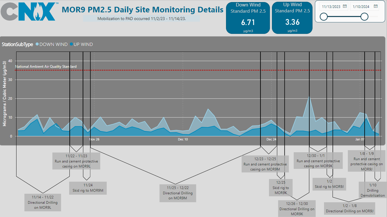 What we can also confirm is that during the monitoring period of the horizontal rig from November 14, 2023, until demobilization of the equipment around January 10, 2024, PM2.5 24-hour averages were well below the National Ambient Air Quality Standard of 35 micrograms/cubic meter (µg/m3) (24-hour standard). The downwind average for the period of time covering horizontal drilling operations (6.71 µg/m3) shows there is better air quality, in terms of PM2.5, on this pad than there generally is in Allegheny County, which had a 2022 PM2.5 Level (Annual Average) of 8.52 µg/m3, as published in Clearing the Air 4.01, a report that focuses on the region’s air quality improvements since 2000 and how this region compares to other metropolitan areas. Note that these averages are below the USEPA Annual Average PM2.5 Standard of 12.0 µg/m3. Additionally, the average differential between our upwind monitor and our downwind monitor that we observed is just over 3 µg/m3. We are providing these preliminary observations as we continue to analyze and learn from the detailed data that we collected. Even though we are below any regulatory standards, we are committed to continuous improvement and we are correlating the readings with our operational activities so we can do just that.