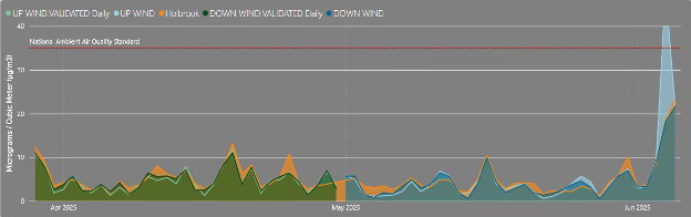 After 20 months of monitoring, we are still experiencing new things in the Radical Transparency program and learning from those experiences. While the experience has provided an abundance of positive news, we are learning that, on occasion, we will encounter an event that none of us would have considered causing concern. A neighbor’s wood burner, a farmer working the field, and even small insects swarming to do what comes naturally, have all presented our teams with occasional head-scratchers as they pushed our investigation beyond our operations to find the source of high readings. This past week, another first was encountered that created our first exceedance of the National Ambient Air Quality Standard (NAAQS) for a daily average of particles with a mean diameter smaller than 2.5 micrometers (PM2.5).