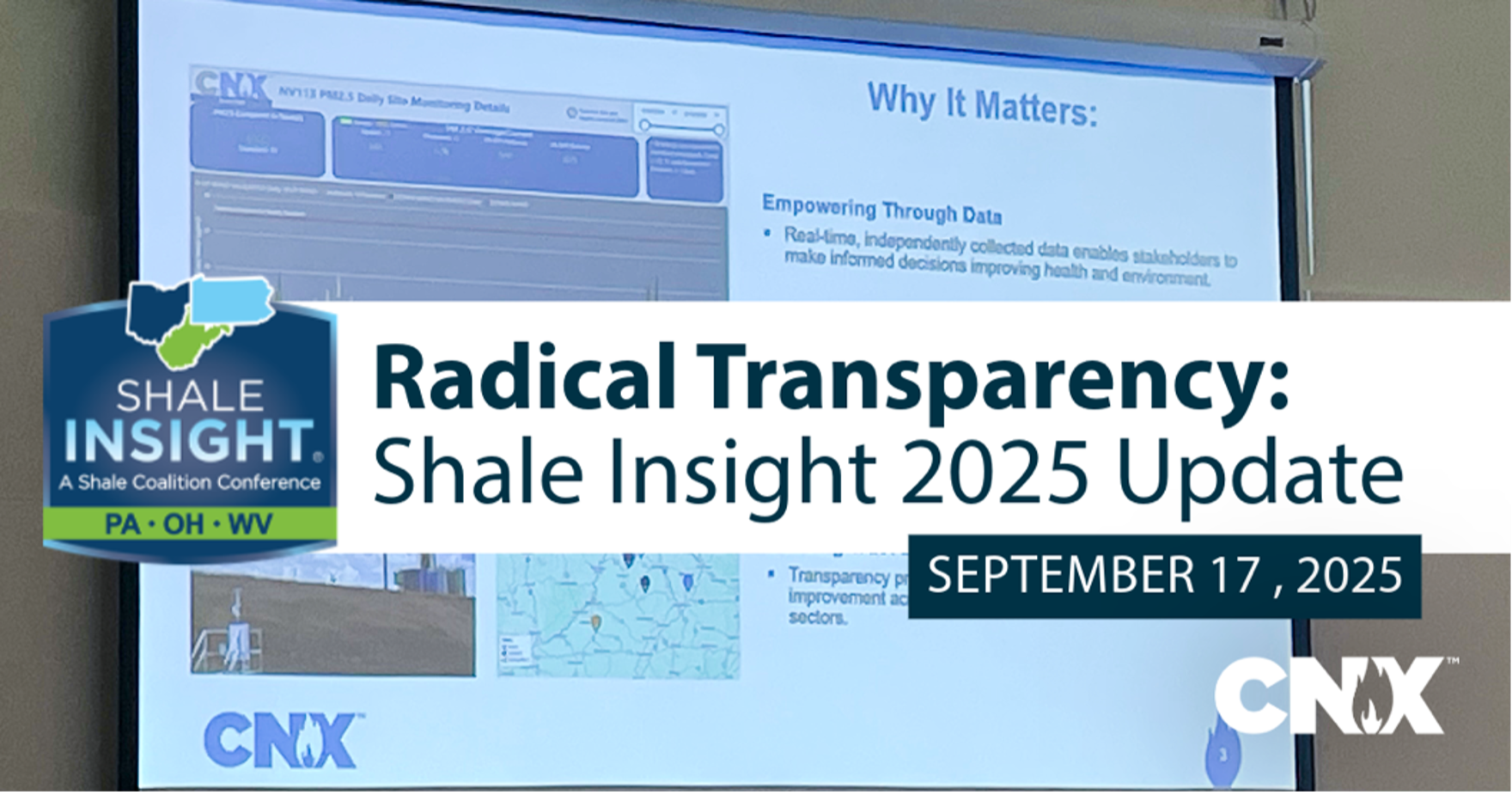 Carrie Crumpton, Vice President of Environmental Strategy, presented on behalf of CNX at the 2025 Shale Insight Conference. Carrie provided an overview and update on CNX’s Radical Transparency initiative during the “Clearing the Air: An Update to Public-Private Air Quality Monitoring Commitments within the Appalachian Basin” session. The following is a summary of Carrie’s remarks.
